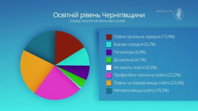 ДетальнішеСеред дорослого населення повну загальну середню освіту мають 15% населення, базову загальну середню – 9%, початкову загальну – 7%, дошкільну –