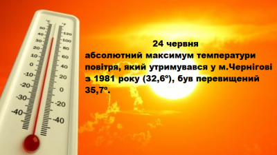 ДетальнішеЧерговий спекотний рекорд у Чернігові. У четвер, 24 червня, температура повітря у місті перевищила абсолютний максимум, встановлений у 1981 році (+32