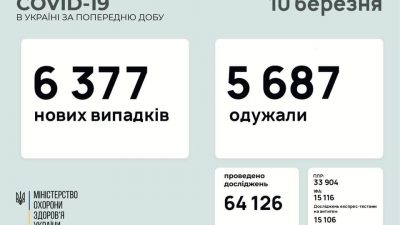 Детальніше6 377 нових випадків коронавірусної хвороби COVID-19 зафіксовано в Україні станом на 10 березня 2021 року. Зокрема, захворіли 309 дітей та 263 медпр