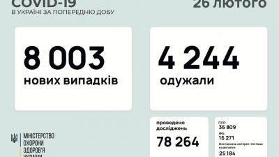 Детальніше8 003 нових випадків коронавірусної хвороби COVID-19 зафіксовано в Україні станом на 26 лютого 2021 року. Зокрема, захворіли 475 дітей та 312 медпрац