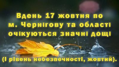 ДетальнішеВдень, 17 жовтня, у Чернігові та області очікуються значні дощі. Про це повідомляє Чернігівський обласний центр з гідрометеорології на своїй сторі