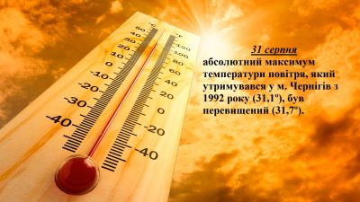 "31 серпня абсолютний максимум температури повітря, який утримувався у м. Чернігів з 1992 року (31,1°), був перевищений (31,7°)" Повідомляє Черні
