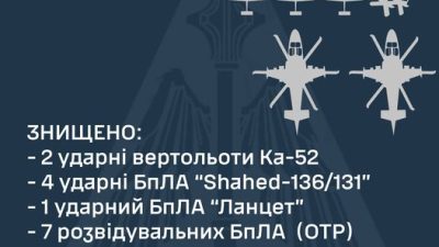 ДетальнішеЗа минулу добу 17 червня та початок поточної доби 18 червня протиповітряною обороною Повітряних Сил знищено два ворожі ударні вертольоти Ка-52, чотир