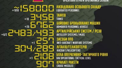 За минулу добу українські захисники ліквідували 1010 російських окупантів. Загалом з початку повномасштабного вторгнення втрати ворога у живій сил