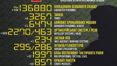 ДетальнішеУкраїнські захисники за минулу добу ліквідували 1140 російських окупантів. З початку повномасштабного вторгнення росія втратила в Україні 136 88