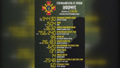 За 120 днів війни в Україні росія втратила 34 430 військових, 216 літаків та 1 504 танки. За даними Генштабу ЗСУ, тільки за минулу добу українські во